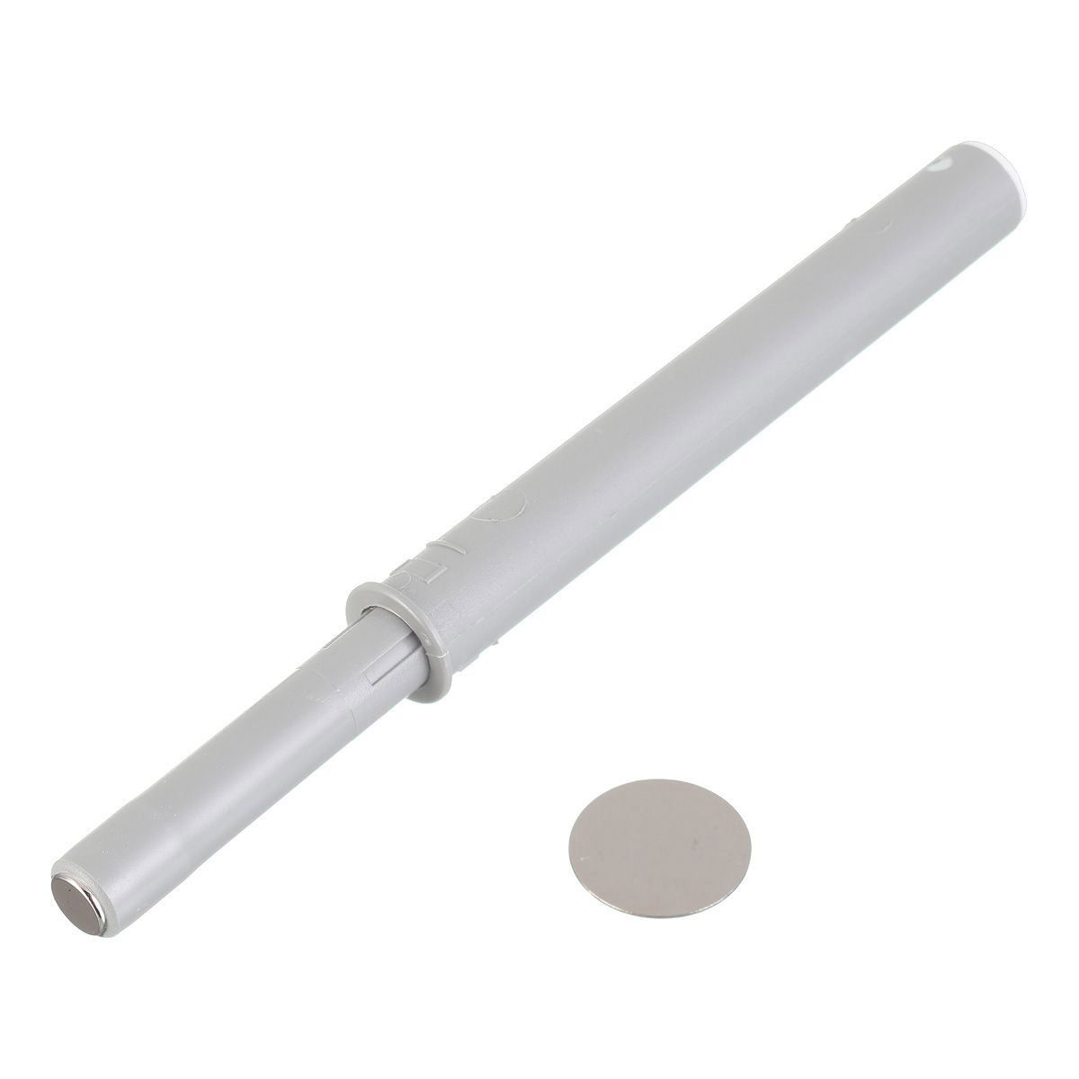 товара Выталкиватель AM-OWM длинный с магнитным окончанием, серый - приспособление для открытия створки фасада или выдвижения ящика без использования мебельной ручки. Вы нажимаете на дверцу шкафа или лицевую сторону ящика, и срабатывает система Push to open. Благодаря магнитному окончанию цилиндра-демпфера, осуществляется дополнительная фиксация дверцы или ящика в закрытом состоянии. Выталкиватель устанавливается посредством врезки в торец корпуса мебельной конструкции. КОМПЛЕКТАЦИЯ Цилиндрический выталкиватель – 1 шт. Металлическая круглая ответная планка – 1 шт.