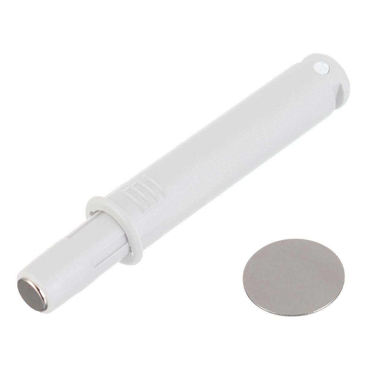 товара Выталкиватель AM-OWM короткий с магнитным окончанием, белый - приспособление для открытия створки фасада или выдвижения ящика без использования мебельной ручки. Вы нажимаете на дверцу шкафа или лицевую сторону ящика, и срабатывает система Push to open. Благодаря магнитному окончанию цилиндра-демпфера, осуществляется дополнительная фиксация дверцы или ящика в закрытом состоянии. Выталкиватель устанавливается посредством врезки в торец корпуса мебельной конструкции. КОМПЛЕКТАЦИЯ Цилиндрический выталкиватель – 1 шт. Металлическая круглая ответная планка – 1 шт.