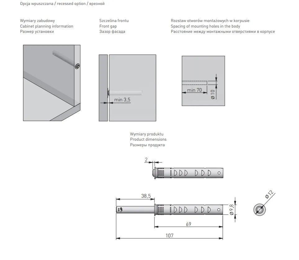 Выталкиватель врезной GTV Salto Nova длинный с каучуковым окончанием, серый - функциональная фурнитура, предназначенная для открывания дверцы шкафа или выдвижения ящика в отсутствии мебельной ручки. Вы нажимаете на створку/ящик и открываете/выдвигаете фасад/ящик. Способ монтажа выталкивателя - врезной: для установки сверлится отверстие в торце корпуса мебельной конструкции. ПРЕИМУЩЕСТВА Каучуковый наконечник способствует бесшумному и мягкому закрыванию фасада. Сертификат SGS, подтверждающий высокое качество выталкивателя в соответствии с европейскими стандартами, а также проведенные испытания, гарантирующие 100 000 рабочих циклов. Минимальный зазор между фасадом и корпусом – 3,5 мм. КОМПЛЕКТАЦИЯ Выталкиватель – 1 шт.