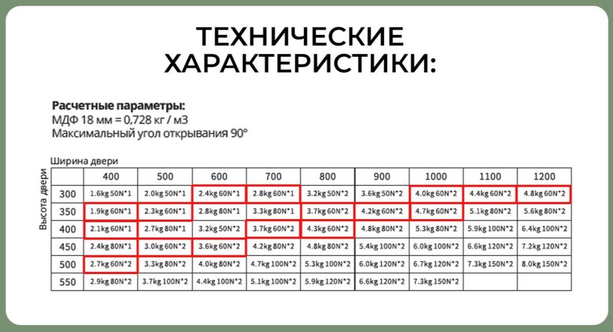 Доп. информация:кол-во газлифтов на дверцу подбираем по таблице;