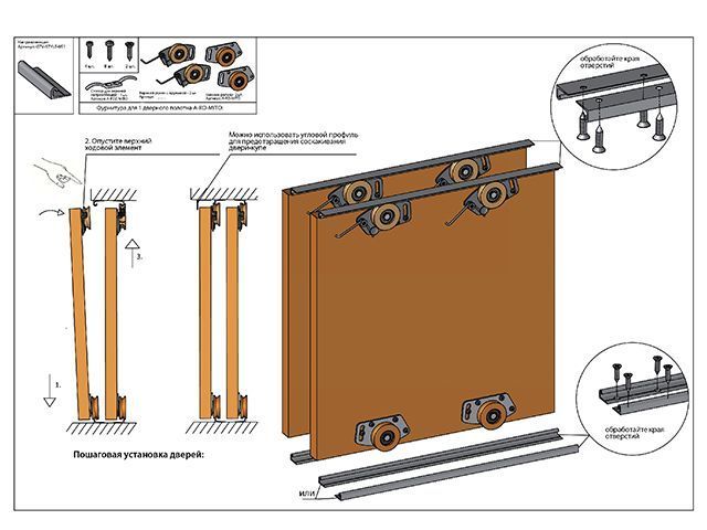 Это экономичное и эргономичное решение для монтажа раздвижных дверей в гардеробной, где несущая конструкция основана на верхних и нижних роликах, образуя единую конструкцию с направляющим профилем.