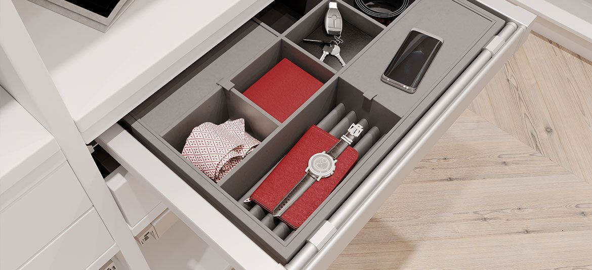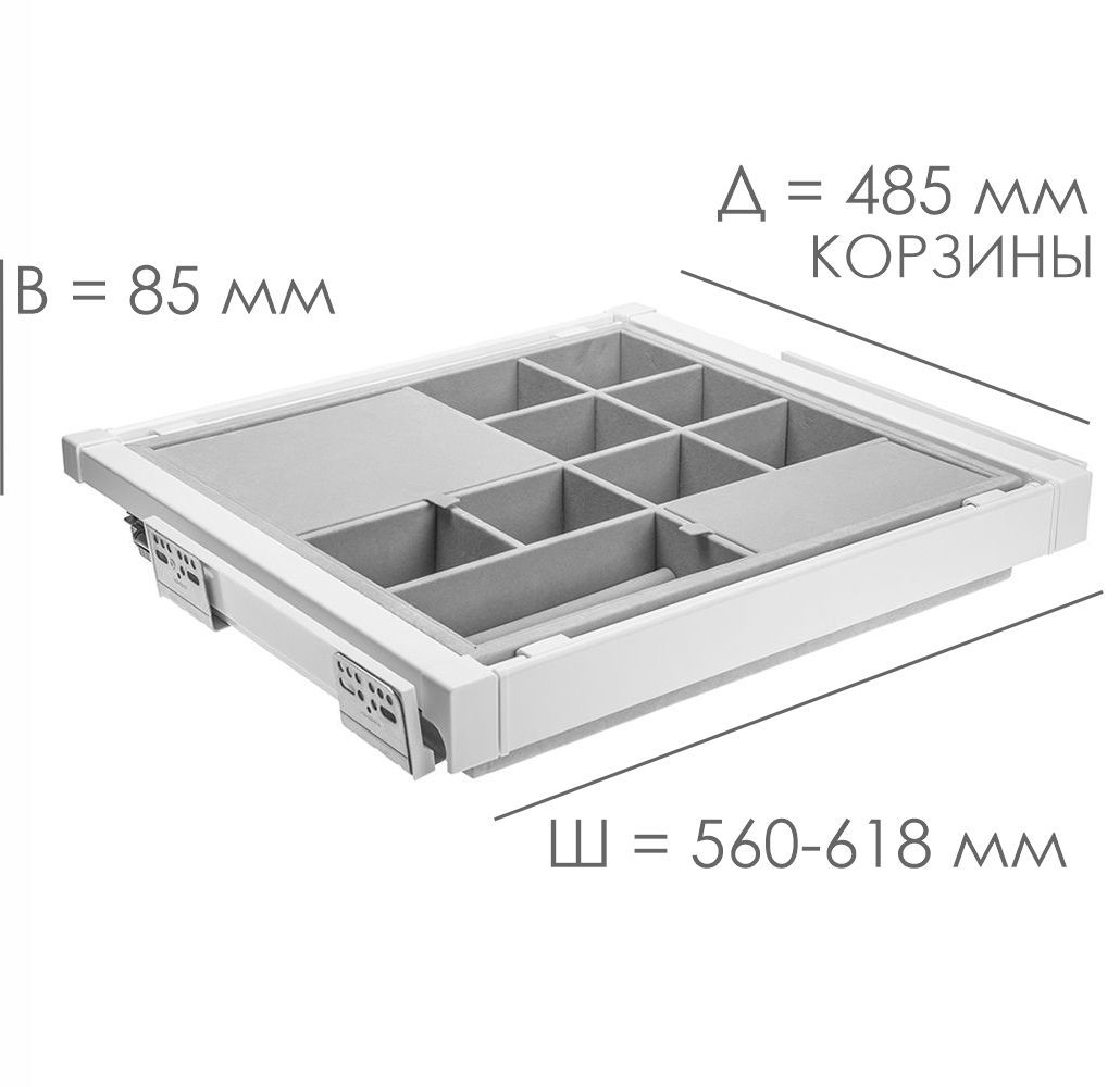 Корзина с органайзером с доводчиком, полного выдвижения - удобное гардеробное наполнение, предназначенное для хранения белья, а также бижутерии и бытовых мелочей. Рабочая поверхность корзины разделена на секции.