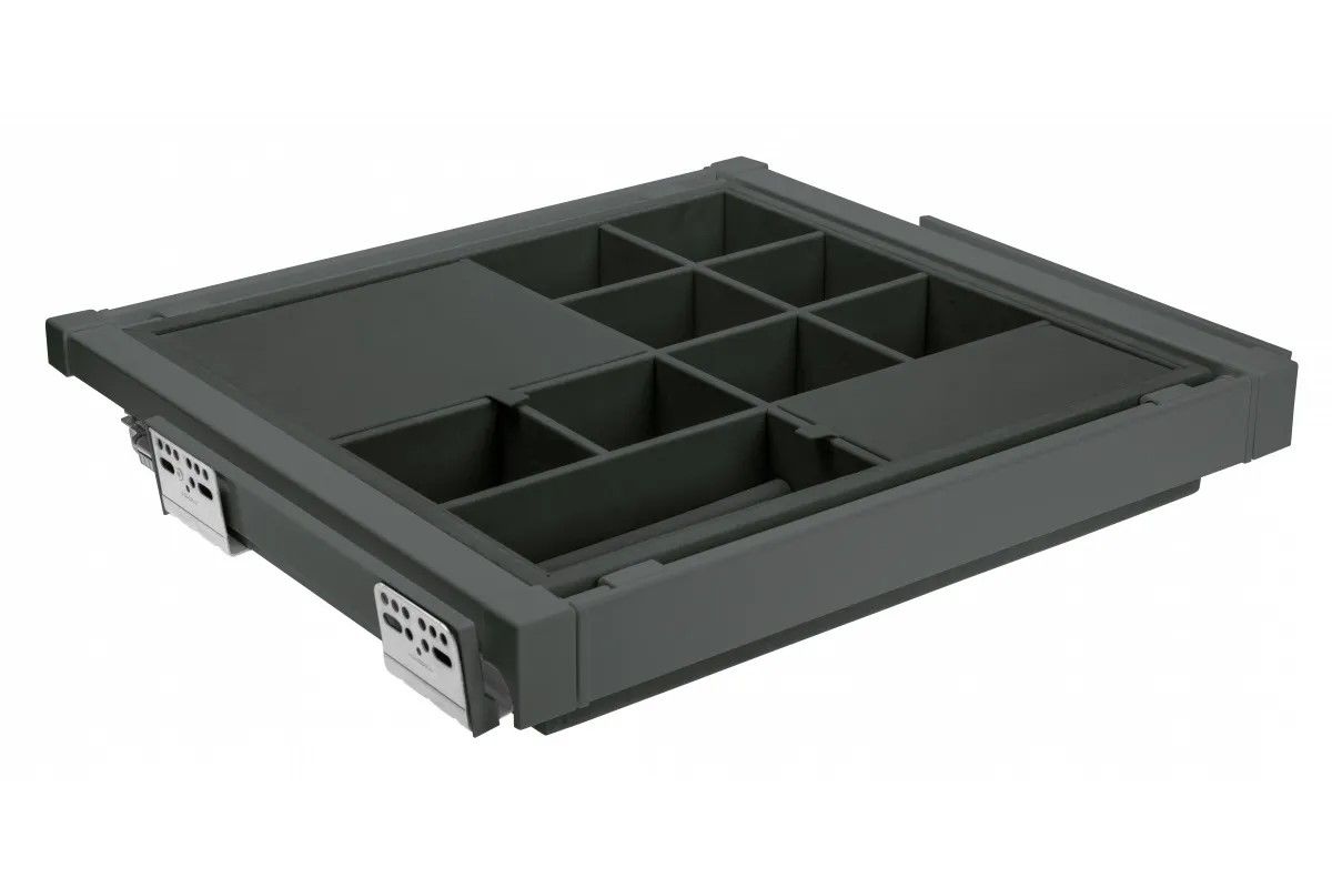Корзина с органайзером ELITE WG-PRZEG90-60-A, в модуль 900 мм, антрацит - удобное гардеробное наполнение, предназначенное для хранения аксессуаров, таких как украшения, заколки, часы, ремни, запонки и прочие мелочи. Рабочая поверхность корзины разделена на секции. Корзина предназначена для модуля с шириной фасада 900 мм, вид монтажа направляющих - нижний (скрытый). Ширина корзины регулируется в диапазоне 860 - 918 мм. КОМПЛЕКТАЦИЯ Корзина - 1 шт. Шариковые направляющие 450 мм (левая и правая) с доводчиком - 1 комплект. Набор креплений для монтажа - 1 комплект. ПРЕИМУЩЕСТВА Благодаря доводчику, корзина плавно и бесшумно задвигается в шкаф. Механизм полного выдвижения обеспечивает легкий доступ к любой вещи в корзине.