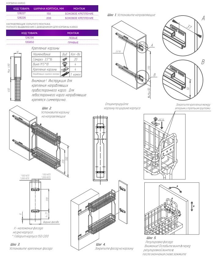 Дополнительно к корзине приобретаются направляющие с боковым креплением на правую или левую сторону. Направляющие скрытого монтажа с синхронизацией обеспечивают плавное и полное выдвижение корзины, а система мягкого закрывания предотвращает удары фасада о корпус, делая использование максимально комфортным и бесшумным. Система выдерживает нагрузку до 20 кг.