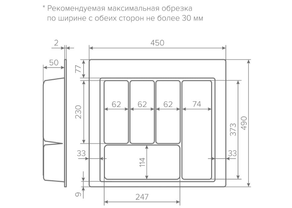 Универсальность лотка по глубине 450-500 мм обеспечивается за счет возможности подрезки AQ TRAY по дальнему краю, что делает применение лотка для разных мебельных решений ещё более удобным.