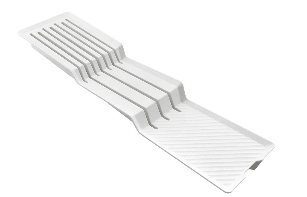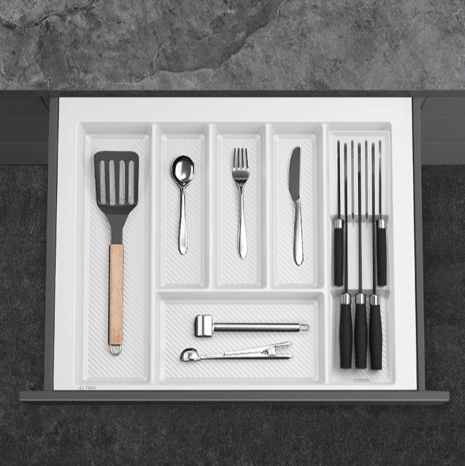 Вкладыш представлен в двух цветах — белом и графитовом, поэтому легко сочетается с любыми кухонными интерьерами. Вкладыш идеально подходит для лотков AQ TRAY шириной от 500 до 900 мм и помогает поддерживать порядок в ящике, делая рабочее пространство более функциональным и аккуратным.