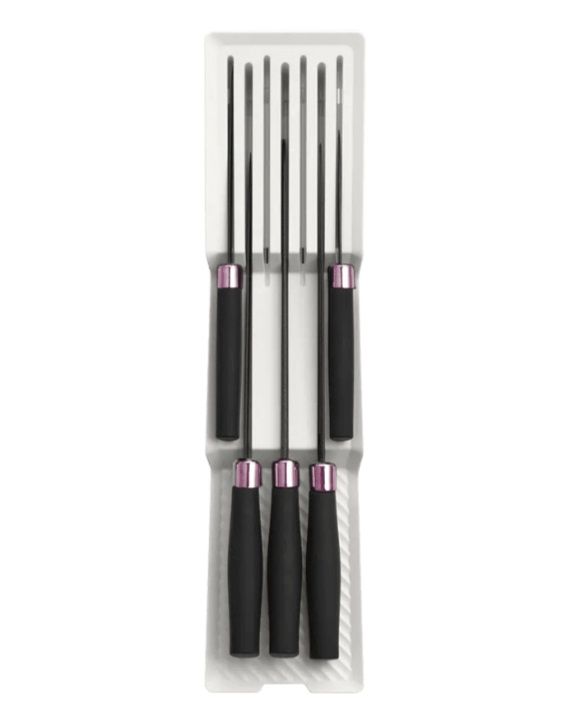 Вкладыш AQ TRAY поможет создать удобную и безопасную систему хранения кухонных ножей. Благодаря продуманному дизайну он позволяет аккуратно разместить до семи ножей разного размера: четыре ножа с лезвием длиной до 130 мм и три ножа с лезвием до 250 мм. Такой способ хранения не только экономит место, но и защищает лезвия от повреждений, а руки — от случайных порезов.