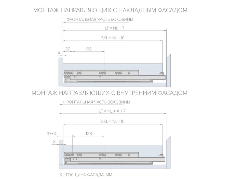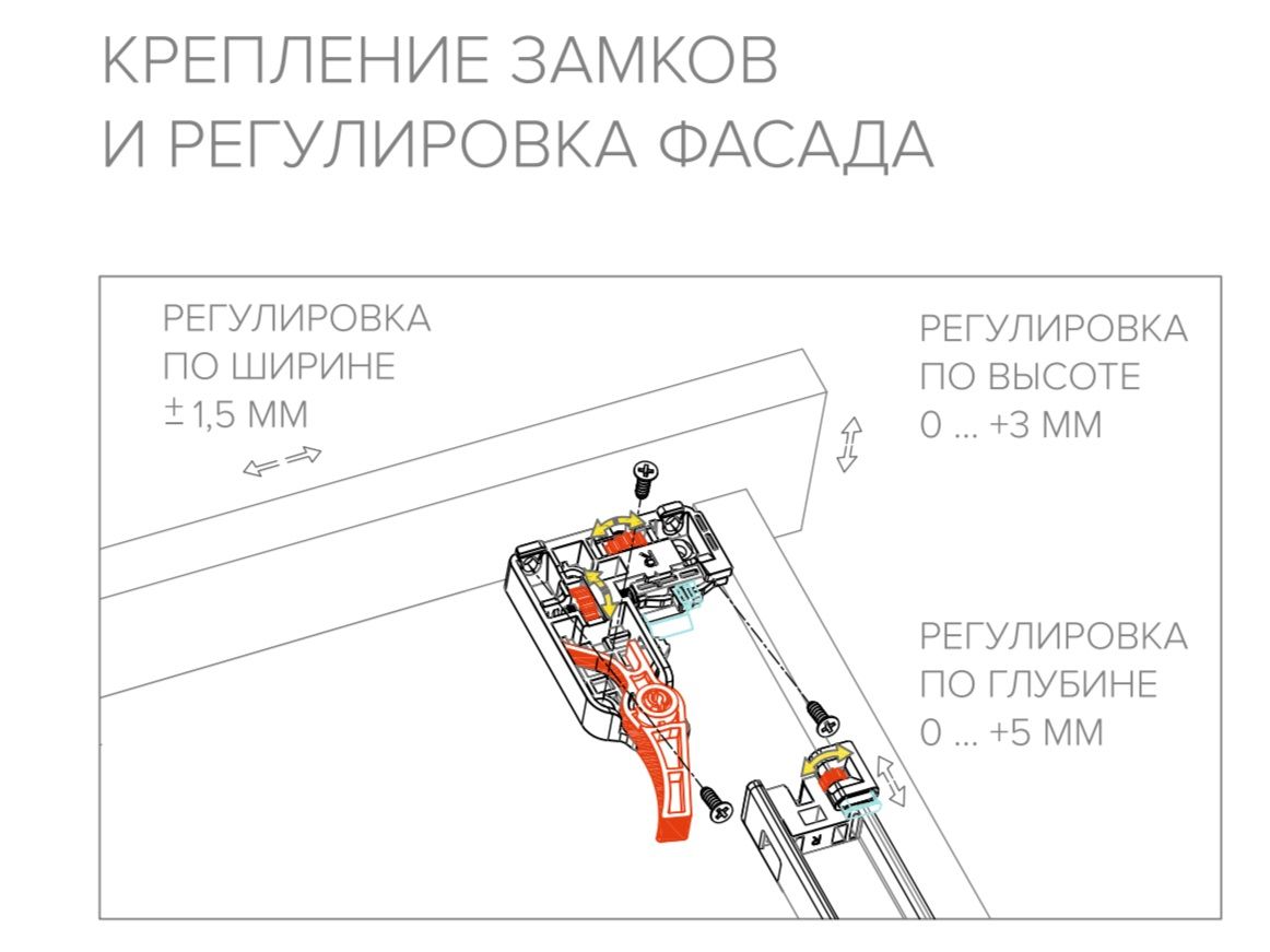 Направляющие скрытого монтажа синхронизированная полного выдвижения с доводчиком AQ имеют широкий размерный ряд, от 270 мм до 550 мм с шагом 50мм и регулируется в трех плоскостях (по высоте, ширине и глубине). Именно благодаря третьей регулировке - по глубине, которая располагается на самой направляющей, вы можете ровно выставить фасады. Подходят для мебели с боковыми стенками из плитного материала толщиной до 19 и 16 мм.