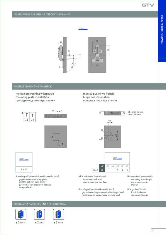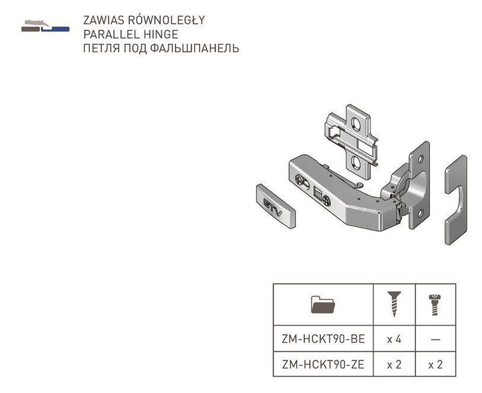 Петля GTV ZM-НСKT 90 градусов угловая самозакрывающаяся для фальшпанелей с планкой с евро. - механизм для открывания фасада под определенным углом, в соответствии с конфигурацией мебельной конструкции. В частности, применяется при использовании в кухонных гарнитурах декоративных плит – фальшпанелей. ПРЕИМУЩЕСТВА Функция плавного и бесшумного закрывания, благодаря встроенному доводчику. Система быстрого монтажа; петля и ответная планка скрепляются защелкиванием. КОМПЛЕКТАЦИЯ Петля – 1 шт. Ответная планка – 1 шт. Маскировочная накладка на плечо – 1 шт. Маскировочная накладка на чашку – 1 шт. Евровинт - 2 шт. Саморезы – 2 шт.