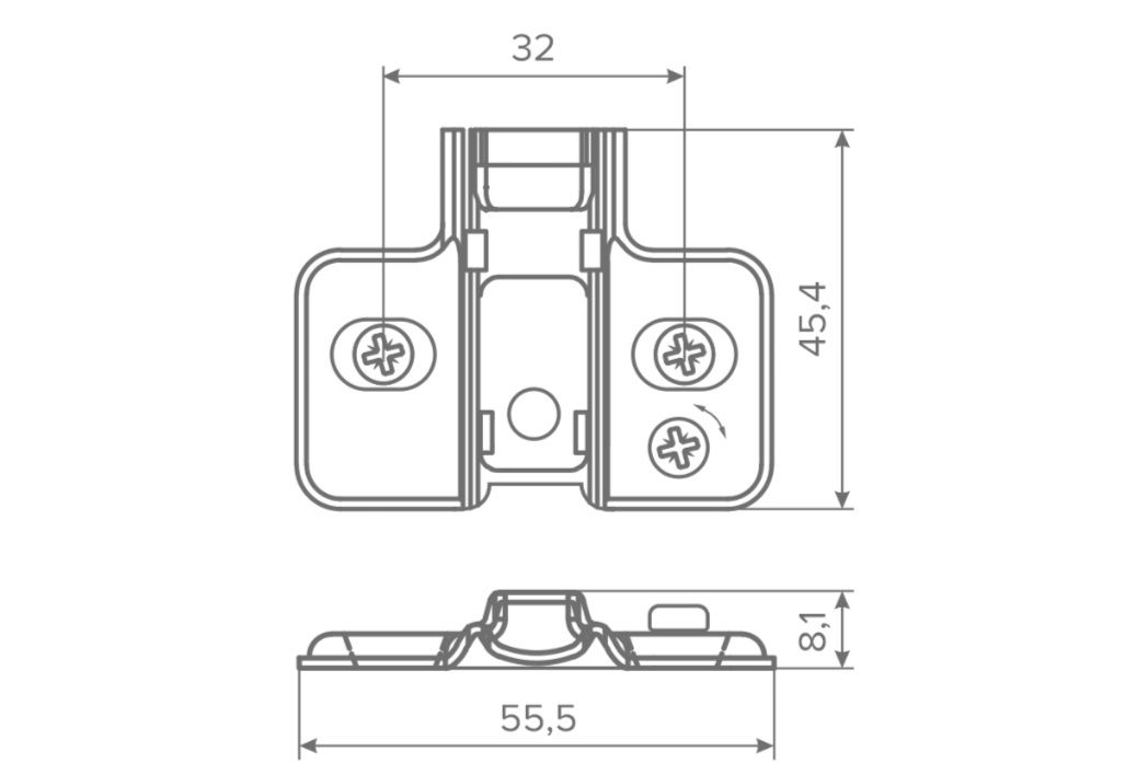 Крестообразная ответная планка Clip-on AQ создана специально для установки с петлями AQ. Наличие эксцентрика позволяет быстро и просто изменять положение фасада по высоте в диапазоне +/-2мм. Мы предлагаем планки в двух высотах Н2 и Н0 под саморез и евровинт, что дает больше свободы в выборе монтажных решений. Планки представлены в цветах никель и черный.