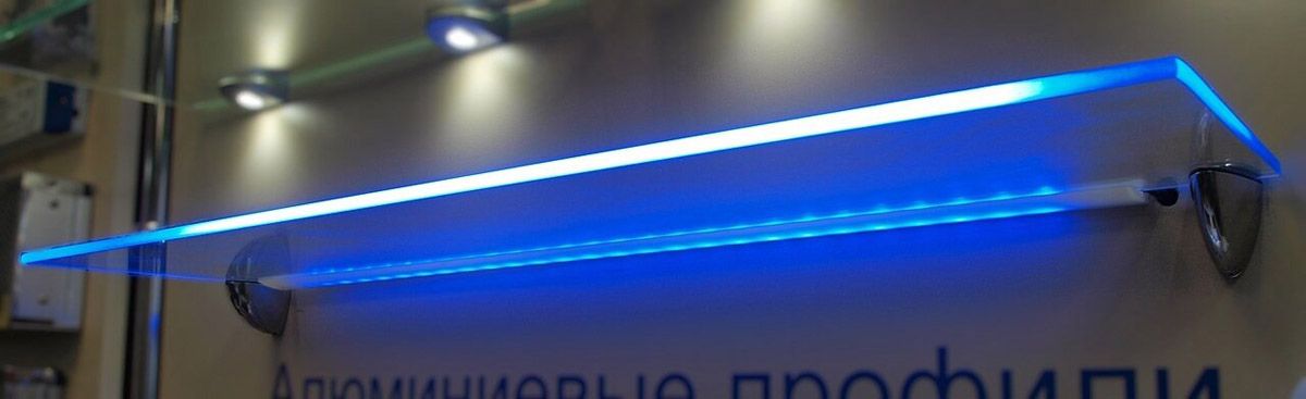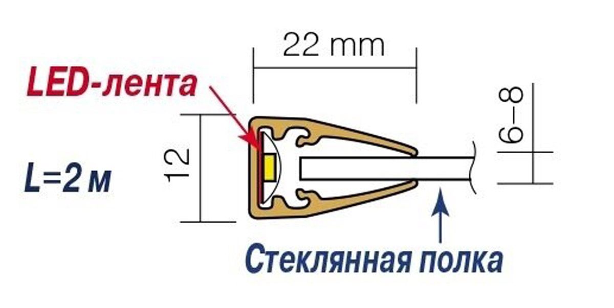 Экструдированный профиль из ПВХ для установки в него светодиодных лент. Конфигурация профиля оптимизирована для использования его в качестве торцевой подсветки стеклянных полок, толщиной 5-8мм.