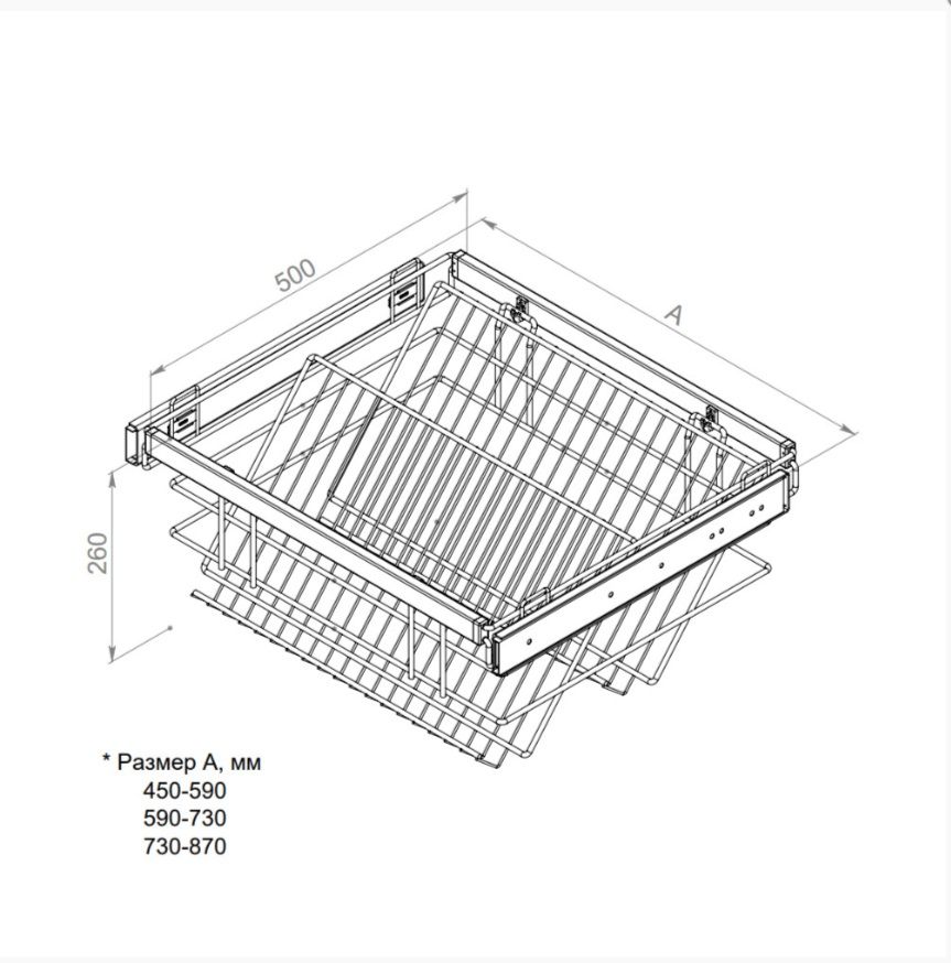 Благодаря телескопическим креплениям, ширина корзины при монтаже регулируется в диапазоне 450-590 мм.