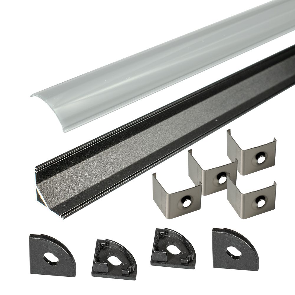 Угловой профиль представляет собой уголок с противослепляющим защитным козырьком и специальнуюпланку, которая расположена под углом в 45°, что служит основой для крепления светододной ленты. Ширина планки 10,5мм, поэтому смело можно применять все виды светодиодных лент, в том числе и светодиодную ленту повышенной мощности (в 2 ряда светодиоды).