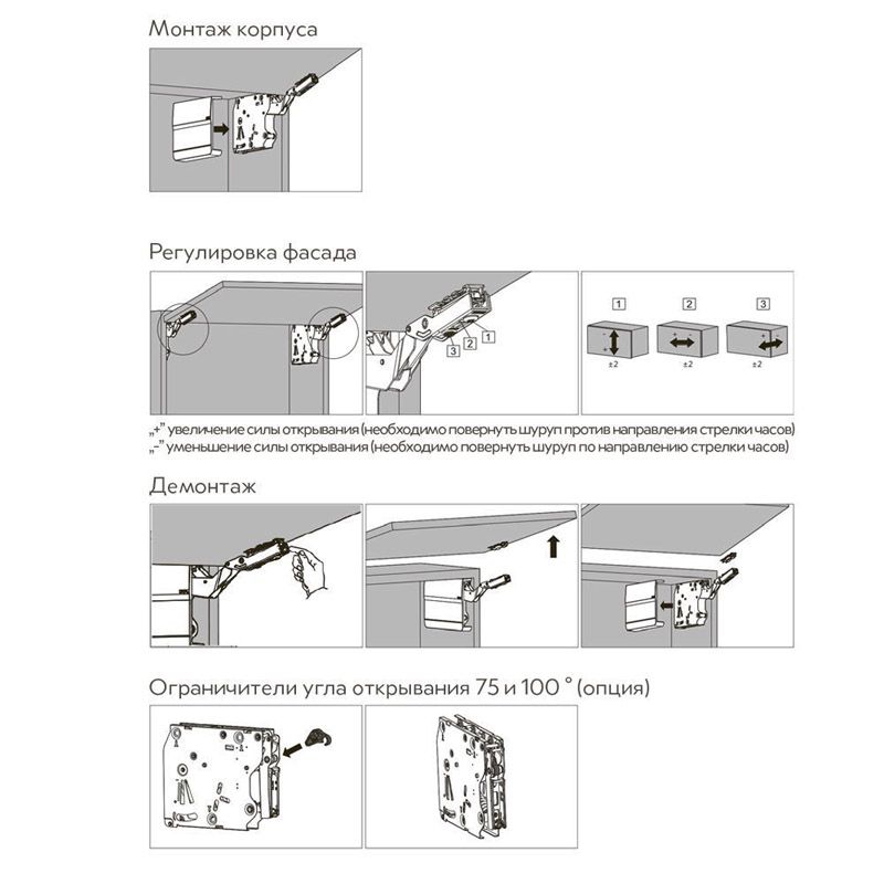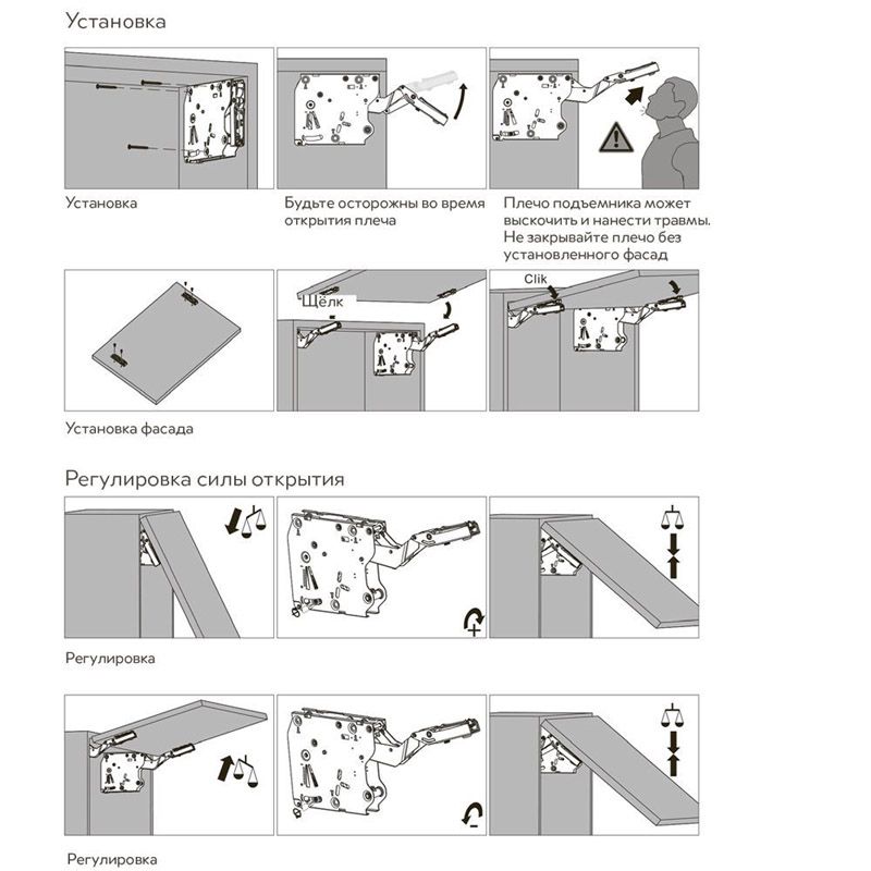 Подъёмник PD-LIFT soft close, слабый коэффициент подъемной силы 580-1250, высота фасада 250-400 мм, антрацит - функциональная мебельная фурнитура, предназначенная для открывания фасада. Для надежного и долгосрочного функционирования, подъемники устанавливаются с левой и с правой стороны фасада. КОМПЛЕКТАЦИЯ Подъемники - 2 шт. (левый и правый). Декоративная панель (заглушка к подъемнику) - 2 шт. (для левого и правого подъемника). Крепления к фасаду - 2 шт. (для левого и правого подъемника). Шурупы 4*38 мм (для дерева) - 6 шт. (для крепления подъемников к стенкам модуля). Шурупы 4*16 мм (для дерева) - 4 шт. (для установки креплений к фасаду). ПРЕИМУЩЕСТВА Не требуется установка мебельных петель. Простая самостоятельная регулировка силы открывания (поворот шурупа по часовой стрелке/против часовой стрелки для уменьшения/увеличения силы открывания). Регулировка фасада по ширине, высоте и глубине (с помощью предустановленных регулировочных винтов на каждом из подъемников). Легкий демонтаж (крепления фасада отщелкиваются - снимается фасад - убираются заглушки у подъемников - подъемники снимаются посредством выкручивания шурупов). ВАЖНОЕ ДОПОЛНЕНИЕ Для правильного подбора нужного механизма по значению подъемной силы и размеру фасада, воспользуйтесь специальным калькулятором по гиперссылке ниже: Калькулятор PD LIFT GTV