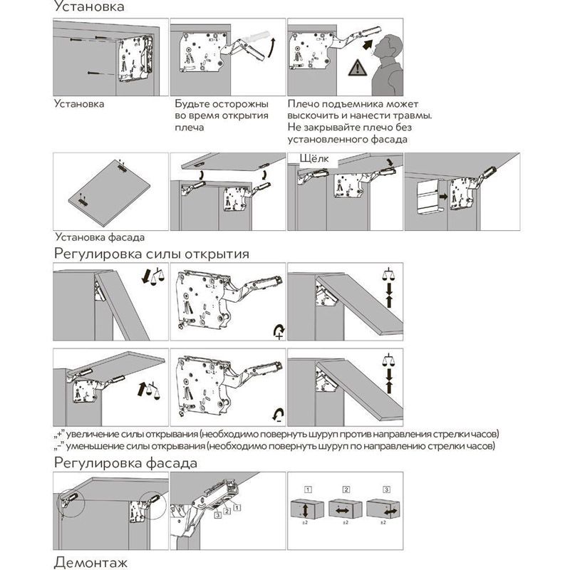 Подъёмник PD-LIFT push to open, сильный коэффициент подъемной силы 1800-4000, высота фасада 250-500 мм, антрацит - функциональная мебельная фурнитура, предназначенная для открывания фасада. Для надежного и долгосрочного функционирования, подъемники устанавливаются с левой и с правой стороны фасада. КОМПЛЕКТАЦИЯ Подъемники - 2 шт. (левый и правый). Декоративная панель (заглушка к подъемнику) - 2 шт. (для левого и правого подъемника). Крепления к фасаду - 2 шт. (для левого и правого подъемника). Врезной демпфер с ответной планкой - 1 шт. Шурупы 4*38 мм (для дерева) - 6 шт. (для крепления подъемников к стенкам модуля). Шурупы 4*16 мм (для дерева) - 5 шт. (для установки креплений к фасаду и для ответной планки демпфера). ПРЕИМУЩЕСТВА Система открывания фасада посредством нажатия (push to open). Не требуется установка мебельных петель. Простая самостоятельная регулировка силы открывания (поворот шурупа по часовой стрелке/против часовой стрелки для уменьшения/увеличения силы открывания). Регулировка фасада по ширине, высоте и глубине (с помощью предустановленных регулировочных винтов на каждом из подъемников). Легкий демонтаж (крепления фасада отщелкиваются - снимается фасад - убираются заглушки у подъемников - подъемники снимаются посредством выкручивания шурупов). ВАЖНОЕ ДОПОЛНЕНИЕ Для правильного подбора нужного механизма по значению подъемной силы и размеру фасада, воспользуйтесь специальным калькулятором по гиперссылке ниже: Калькулятор PD LIFT GTV