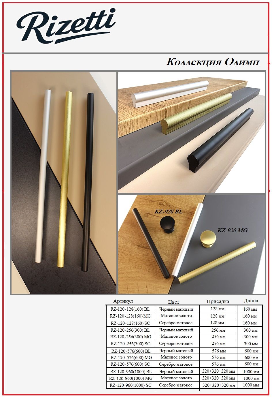 Коллекция представлена ручками-профилями длиной 160 мм, 300 мм, 600 мм и 1000 мм.