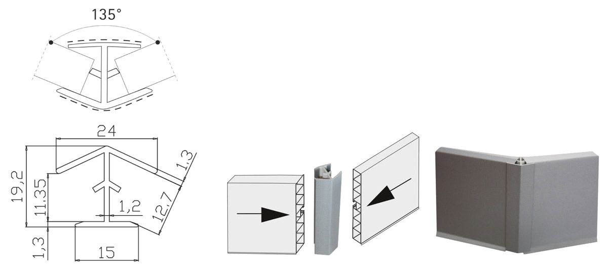 Угол универсальный 135 гр для цоколя - элемент цокольной системы, предназначенный для соединения отрезков декоративной планки под углом в процессе монтажа.