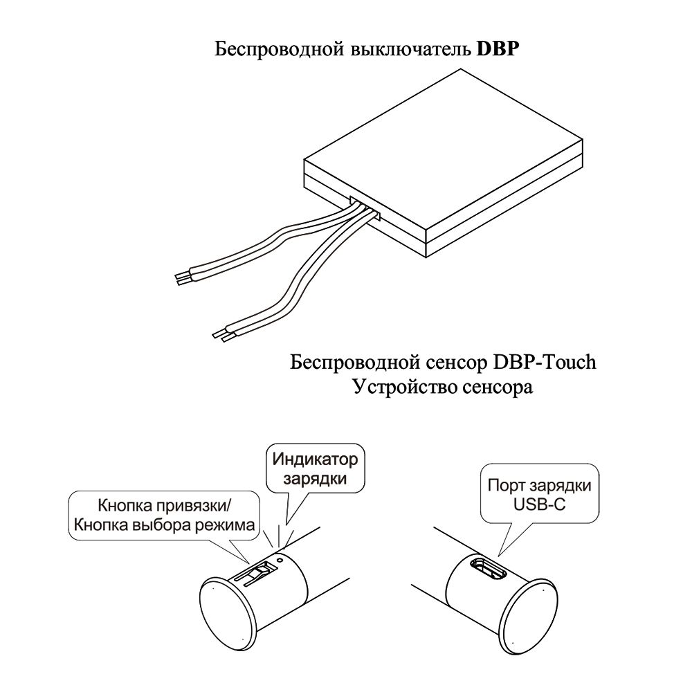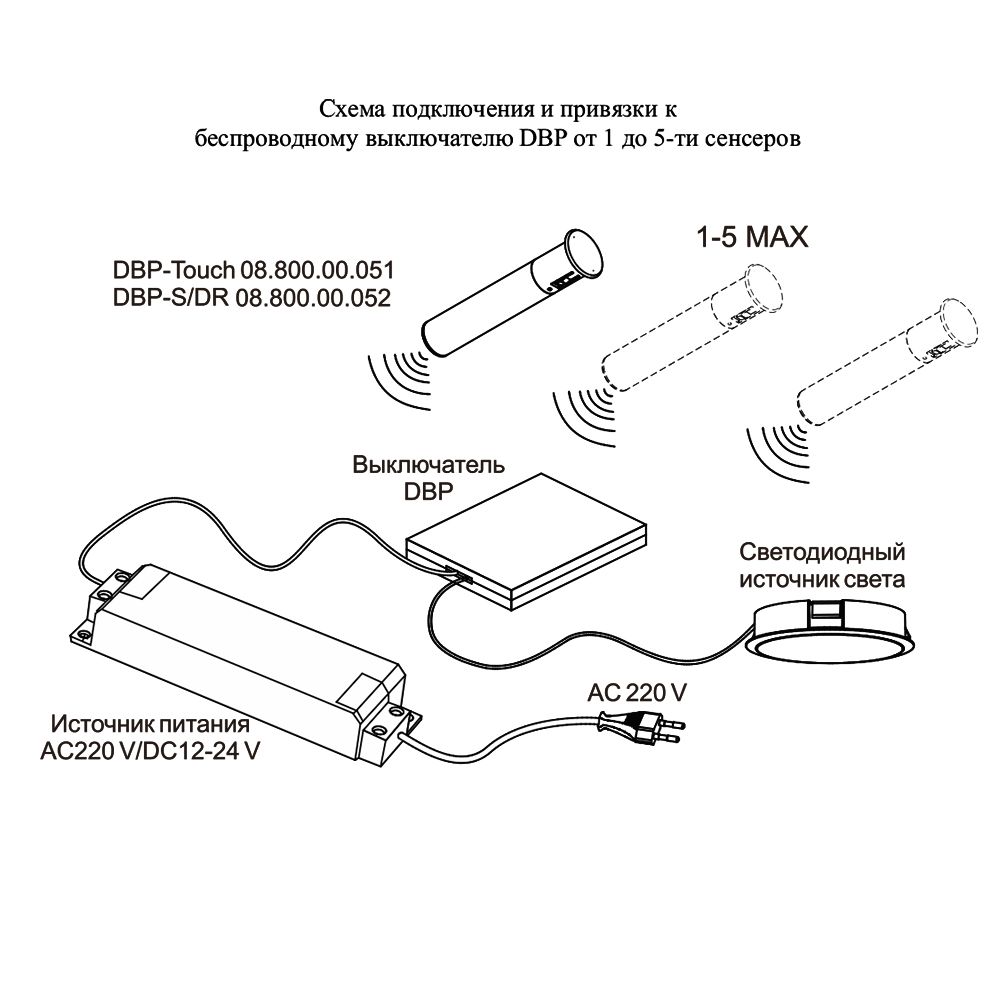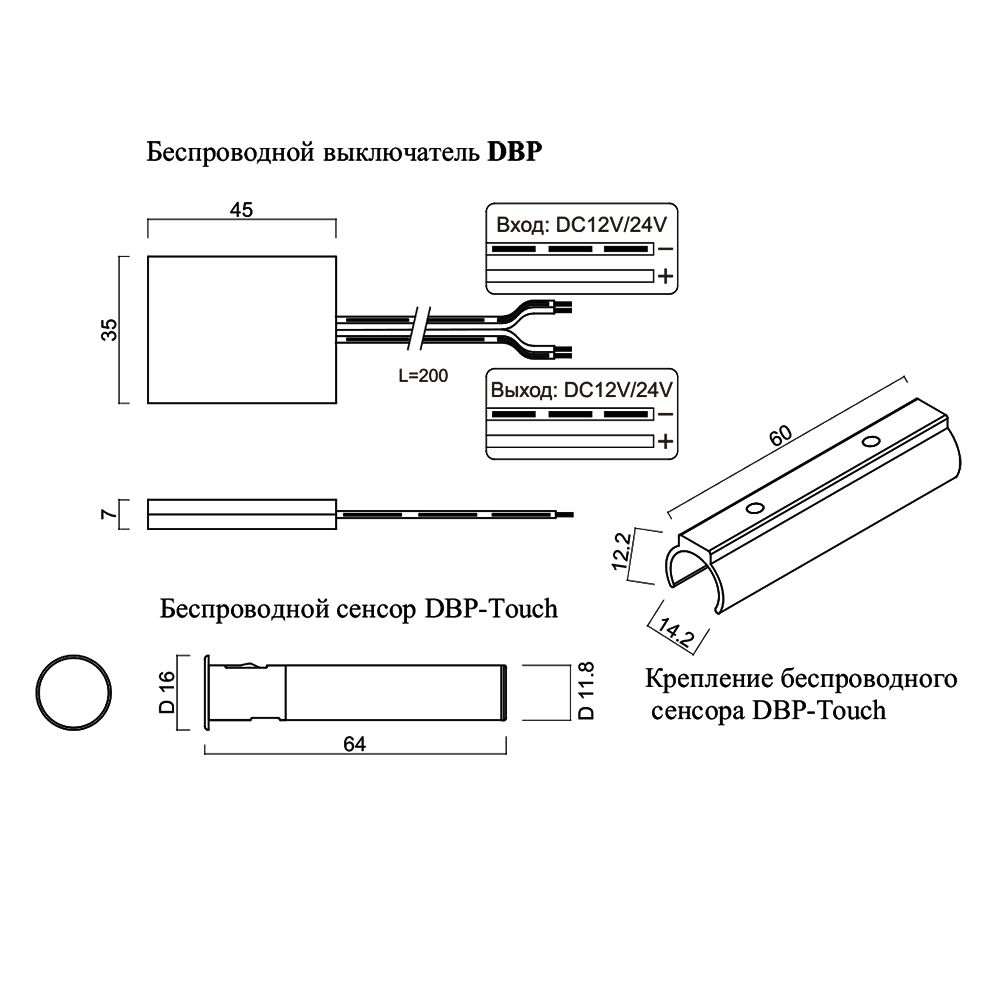 Беспроводной выключатель DBP используется совместно с беспроводным сенсором модели DBP-S/DR и предназначен для включения/выключения светодиодных светильников, которые рассчитаны на питание постоянным напряжением 12В/24В и нагрузку 60Вт/100Вт соответственно.