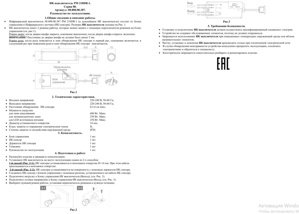 Инфракрасный сенсорный двухрежимный выключатель PM 218DR-1— это универсальная модель выключателя, срабатывающего на движение руки перед ИК-сенсором и на наличие преграды (например, дверцы в шкафу).