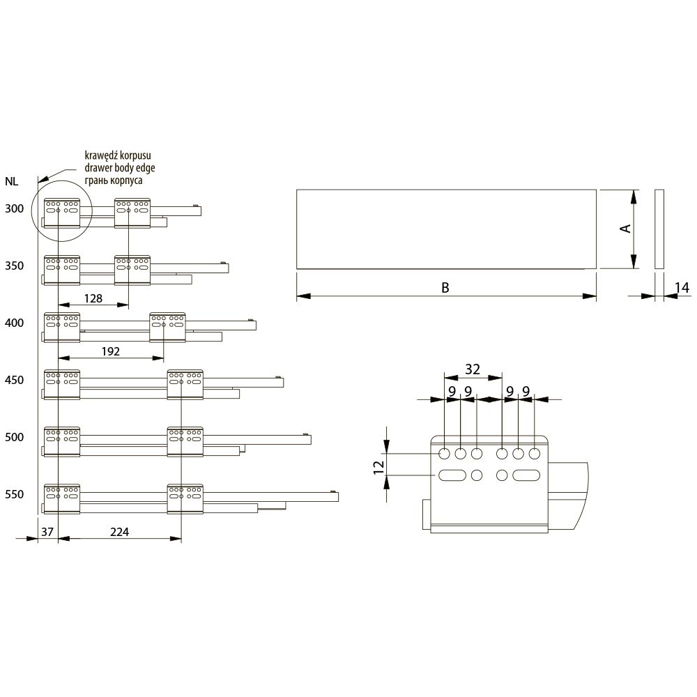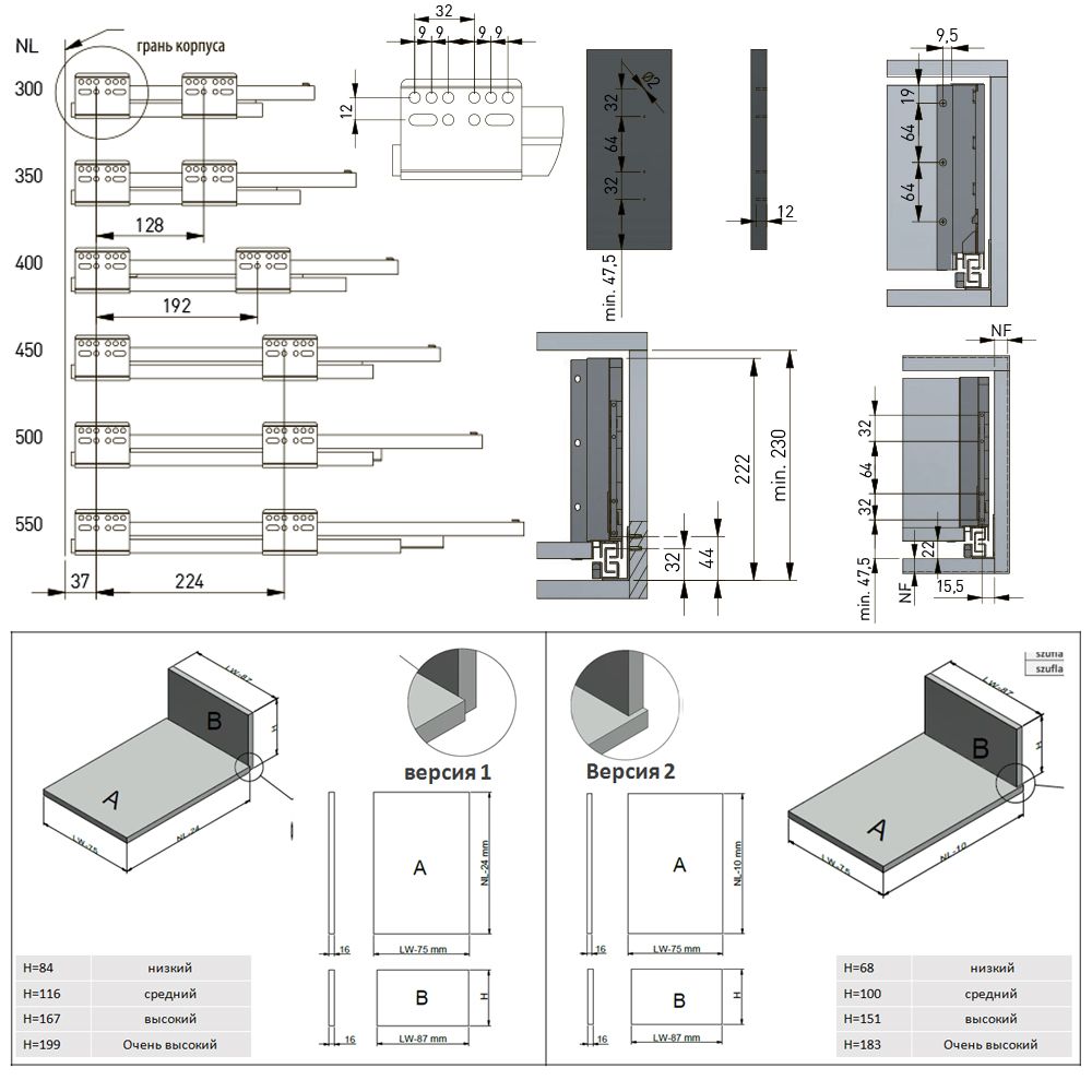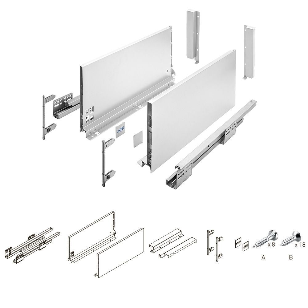 AXIS PRO L-500 мм, высокий H-199 мм, белый - система выдвижения нового поколения с повышенной эргономикой, для использования в кухонных гарнитурах и мебели для ванных комнат. КОМПЛЕКТАЦИЯ Шариковая направляющая полновыкатная, левая - 1 шт. Шариковая направляющая полновыкатная, правая - 1 шт. Боковая панель, левая - 1 шт. Боковая панель, правая - 1 шт. Крепление фасада для левой боковой панели - 1 шт. Крепление фасада для правой боковой панели - 1 шт. Крепление задней стенки для левой боковой панели - 1 шт. Крепление задней стенки для правой боковой панели - 1 шт. Заглушка для монтажных отверстий левой боковой панели - 1 шт. Заглушка для монтажных отверстий правой боковой панели - 1 шт. Саморезы для монтажа. ПРЕИМУЩЕСТВА Эстетичный дизайн за счет тонких боковых стенок (14 мм) и привлекательного декора. Максимальная вместимость ящика, достигнутая посредством нижнего монтажа направляющих и минимальной толщины боковых панелей. Регулировка фасада в вертикальной (+/- 2 мм) и горизонтальной (+/- 2 мм) плоскостях. Полное выдвижение, обеспечивающее удобный доступ к содержимому ящика. Мягкое и тихое задвижение, благодаря доводчику. ВАЖНОЕ ДОПОЛНЕНИЕ В случае необходимости аксессуары для AXIS PRO приобретаются отдельно.