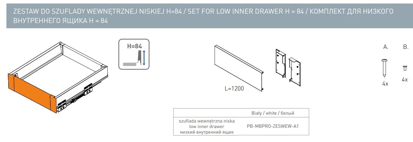 Комплект для низкого внутреннего ящика Modern Box PRO (панель Н-84 мм + крепление), белый - набор для сборки выкатного короба, размещаемого внутри корпуса, который закрывает общий фасад в системе выдвижения Модерн Бокс Про. КОМПЛЕКТАЦИЯ Передняя панель - 1 шт. Соединители передней панели - 2 шт. Крепеж для монтажа.