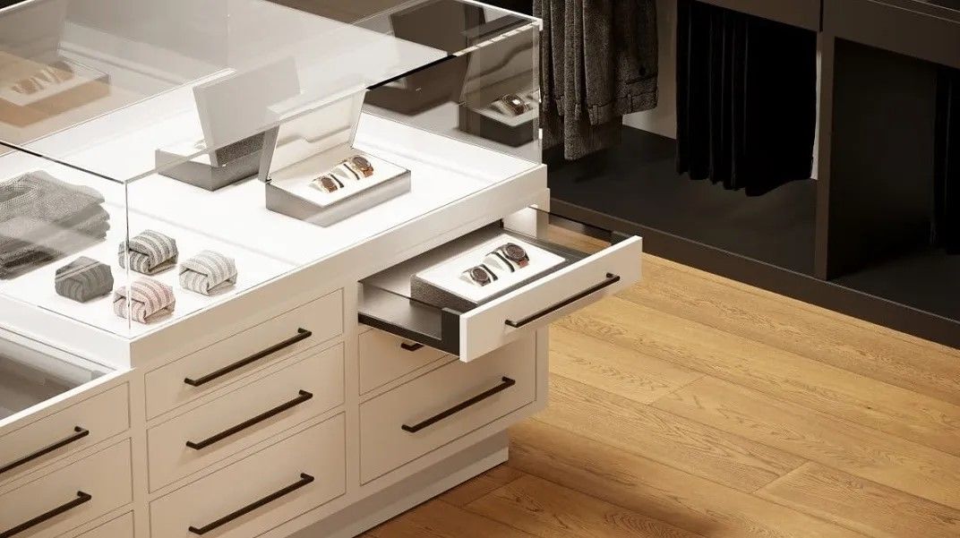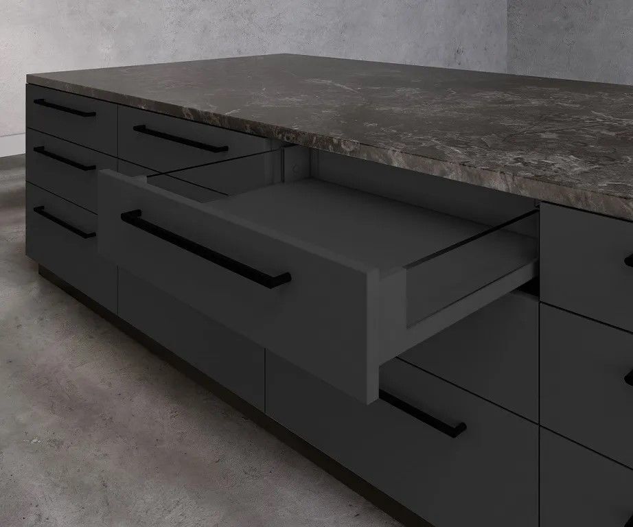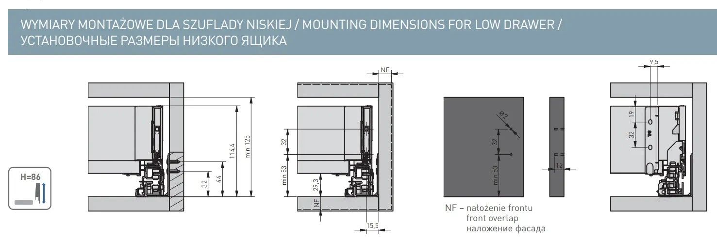 AXIS PRO L-350 мм, низкий H-86 мм, со стеклянными боковинами, антрацит - мебельная система выдвижения, представляющая собой набор из направляющих, боковых стенок и креплений. В первую очередь данная система предназначена для гардеробных, но также может использоваться в ванных комнатах и в кухонных помещениях. КОМПЛЕКТАЦИЯ Шариковая направляющая полновыкатная, левая - 1 шт. Шариковая направляющая полновыкатная, правая - 1 шт. Боковая панель, левая - 1 шт. Боковая панель, правая - 1 шт. Крепление фасада для левой боковой панели - 1 шт. Крепление фасада для правой боковой панели - 1 шт. Крепление задней стенки для левой боковой панели - 1 шт. Крепление задней стенки для правой боковой панели - 1 шт. Заглушка для монтажных отверстий левой боковой панели - 1 шт. Заглушка для монтажных отверстий правой боковой панели - 1 шт. Саморезы для монтажа. ПРЕИМУЩЕСТВА Стеклянные боковины ящиков добавляют интерьеру необычный выразительный элемент. Мебельная конструкция воспринимается как более светлая и просторная. Плавное и бесшумное закрывание. Стильное дымчатое закаленное стекло. Полное выдвижение; легкий доступ к хранящимся в ящике вещам. Нагрузка до 40 кг. Сертификат испытаний на 60 000 рабочих циклов. Регулировка фасада по горизонтали (+/- 2,5 мм) и вертикали (+/- 2 мм). Дополнительная регулировка наклона фасада: +/- 2 мм. Функциональные элементы, используемые для регулировки, расположены на внутренней стороне боковины, то есть внутри ящика. Таким образом легче осуществлять регулировку, когда ящик расположен боковиной у стены. Техническое примечание от производителя: для правильной работы направляющей рекомендованная ширина ящика не должна превышать номинальной длины направляющей. ВАЖНОЕ ДОПОЛНЕНИЕ В случае необходимости изготовления внутреннего ящика, соответствующие аксессуары для AXIS PRO приобретаются отдельно.