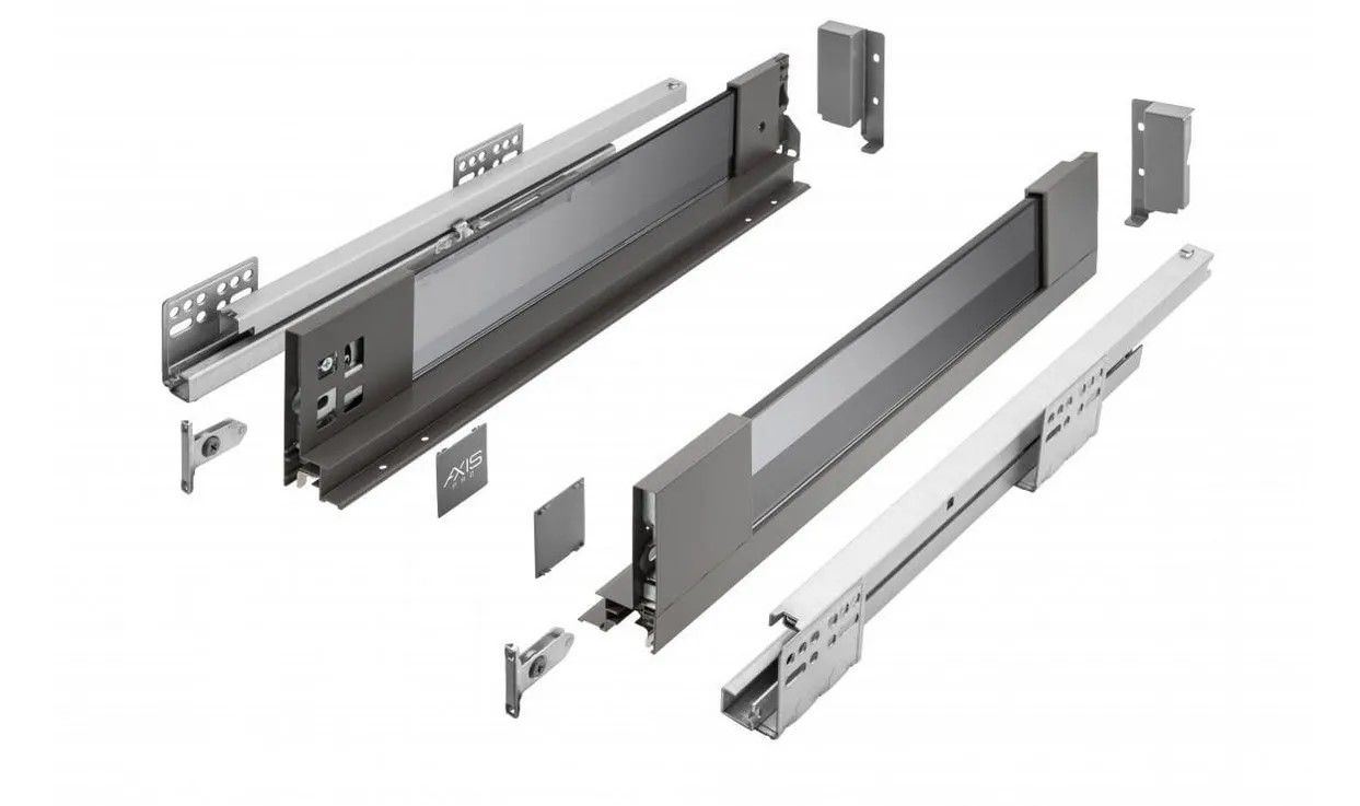 AXIS PRO L-550 мм, низкий H-86 мм, со стеклянными боковинами, антрацит - мебельная система выдвижения, представляющая собой набор из направляющих, боковых стенок и креплений. В первую очередь данная система предназначена для гардеробных, но также может использоваться в ванных комнатах и в кухонных помещениях. КОМПЛЕКТАЦИЯ Шариковая направляющая полновыкатная, левая - 1 шт. Шариковая направляющая полновыкатная, правая - 1 шт. Боковая панель, левая - 1 шт. Боковая панель, правая - 1 шт. Крепление фасада для левой боковой панели - 1 шт. Крепление фасада для правой боковой панели - 1 шт. Крепление задней стенки для левой боковой панели - 1 шт. Крепление задней стенки для правой боковой панели - 1 шт. Заглушка для монтажных отверстий левой боковой панели - 1 шт. Заглушка для монтажных отверстий правой боковой панели - 1 шт. Саморезы для монтажа. ПРЕИМУЩЕСТВА Стеклянные боковины ящиков добавляют интерьеру необычный выразительный элемент. Мебельная конструкция воспринимается как более светлая и просторная. Плавное и бесшумное закрывание. Стильное дымчатое закаленное стекло. Полное выдвижение; легкий доступ к хранящимся в ящике вещам. Нагрузка до 40 кг. Сертификат испытаний на 60 000 рабочих циклов. Регулировка фасада по горизонтали (+/- 2,5 мм) и вертикали (+/- 2 мм). Дополнительная регулировка наклона фасада: +/- 2 мм. Функциональные элементы, используемые для регулировки, расположены на внутренней стороне боковины, то есть внутри ящика. Таким образом легче осуществлять регулировку, когда ящик расположен боковиной у стены. Техническое примечание от производителя: для правильной работы направляющей рекомендованная ширина ящика не должна превышать номинальной длины направляющей. ВАЖНОЕ ДОПОЛНЕНИЕ В случае необходимости изготовления внутреннего ящика, соответствующие аксессуары для AXIS PRO приобретаются отдельно.