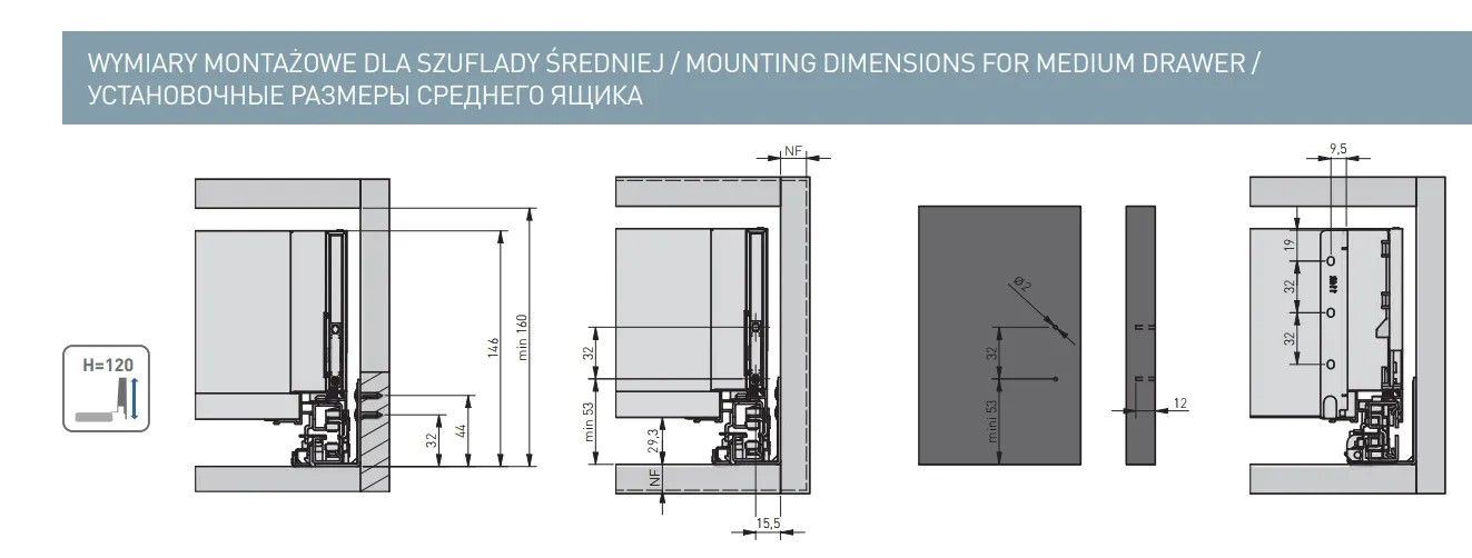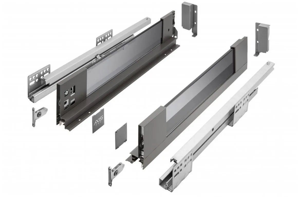 AXIS PRO L-450 мм, средний H-120 мм, со стеклянными боковинами, антрацит - мебельная система выдвижения, представляющая собой набор из направляющих, боковых стенок и креплений. В первую очередь данная система предназначена для гардеробных, но также может использоваться в ванных комнатах и в кухонных помещениях. КОМПЛЕКТАЦИЯ Шариковая направляющая полновыкатная, левая - 1 шт. Шариковая направляющая полновыкатная, правая - 1 шт. Боковая панель, левая - 1 шт. Боковая панель, правая - 1 шт. Крепление фасада для левой боковой панели - 1 шт. Крепление фасада для правой боковой панели - 1 шт. Крепление задней стенки для левой боковой панели - 1 шт. Крепление задней стенки для правой боковой панели - 1 шт. Заглушка для монтажных отверстий левой боковой панели - 1 шт. Заглушка для монтажных отверстий правой боковой панели - 1 шт. Саморезы для монтажа. ПРЕИМУЩЕСТВА Стеклянные боковины ящиков добавляют интерьеру необычный выразительный элемент. Мебельная конструкция воспринимается как более светлая и просторная. Плавное и бесшумное закрывание. Стильное дымчатое закаленное стекло. Полное выдвижение; легкий доступ к хранящимся в ящике вещам. Нагрузка до 40 кг. Сертификат испытаний на 60 000 рабочих циклов. Регулировка фасада по горизонтали (+/- 2,5 мм) и вертикали (+/- 2 мм). Дополнительная регулировка наклона фасада: +/- 2 мм. Функциональные элементы, используемые для регулировки, расположены на внутренней стороне боковины, то есть внутри ящика. Таким образом легче осуществлять регулировку, когда ящик расположен боковиной у стены. Техническое примечание от производителя: для правильной работы направляющей рекомендованная ширина ящика не должна превышать номинальной длины направляющей. ВАЖНОЕ ДОПОЛНЕНИЕ В случае необходимости изготовления внутреннего ящика, соответствующие аксессуары для AXIS PRO приобретаются отдельно.