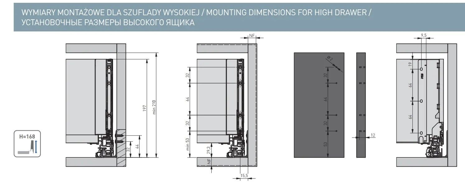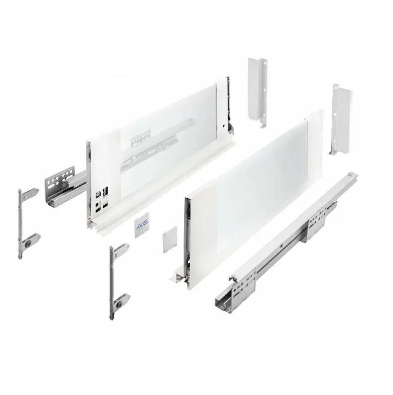AXIS PRO L-450 мм, высокий H-168 мм, со стеклянными боковинами, белый - мебельная система выдвижения, представляющая собой набор из направляющих, боковых стенок и креплений. В первую очередь данная система предназначена для гардеробных, но также может использоваться в ванных комнатах и в кухонных помещениях. КОМПЛЕКТАЦИЯ Шариковая направляющая полновыкатная, левая - 1 шт. Шариковая направляющая полновыкатная, правая - 1 шт. Боковая панель, левая - 1 шт. Боковая панель, правая - 1 шт. Крепление фасада для левой боковой панели - 1 шт. Крепление фасада для правой боковой панели - 1 шт. Крепление задней стенки для левой боковой панели - 1 шт. Крепление задней стенки для правой боковой панели - 1 шт. Заглушка для монтажных отверстий левой боковой панели - 1 шт. Заглушка для монтажных отверстий правой боковой панели - 1 шт. Саморезы для монтажа. ПРЕИМУЩЕСТВА Стеклянные боковины ящиков добавляют интерьеру необычный выразительный элемент. Мебельная конструкция воспринимается как более светлая и просторная. Плавное и бесшумное закрывание. Стильное дымчатое закаленное стекло. Полное выдвижение; легкий доступ к хранящимся в ящике вещам. Нагрузка до 40 кг. Сертификат испытаний на 60 000 рабочих циклов. Регулировка фасада по горизонтали (+/- 2,5 мм) и вертикали (+/- 2 мм). Дополнительная регулировка наклона фасада: +/- 2 мм. Функциональные элементы, используемые для регулировки, расположены на внутренней стороне боковины, то есть внутри ящика. Таким образом легче осуществлять регулировку, когда ящик расположен боковиной у стены. Техническое примечание от производителя: для правильной работы направляющей рекомендованная ширина ящика не должна превышать номинальной длины направляющей. ВАЖНОЕ ДОПОЛНЕНИЕ В случае необходимости изготовления внутреннего ящика, соответствующие аксессуары для AXIS PRO приобретаются отдельно.