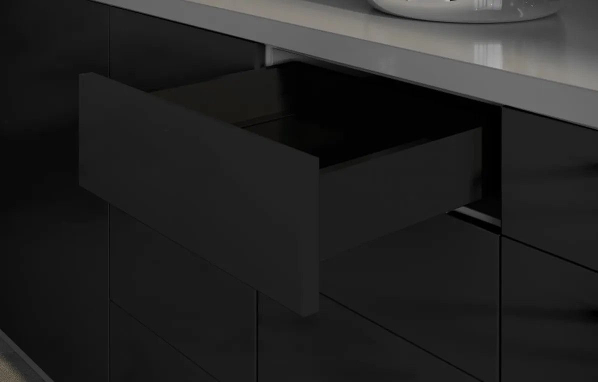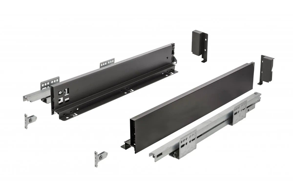 AXIS PRO push to open L-500 мм, низкий H-86 мм, черный - мебельная система выдвижения, представляющая собой набор из направляющих и боковых стенок, для сборки выкатного ящика. Система предназначена для использования в кухонных гарнитурах, а также в шкафах и тумбах различного назначения, где конструктивно предусмотрены выдвижные ящики. КОМПЛЕКТАЦИЯ Шариковая направляющая полновыкатная, левая - 1 шт. Шариковая направляющая полновыкатная, правая - 1 шт. Боковая панель, левая - 1 шт. Боковая панель, правая - 1 шт. Крепление фасада для левой боковой панели - 1 шт. Крепление фасада для правой боковой панели - 1 шт. Крепление задней стенки для левой боковой панели - 1 шт. Крепление задней стенки для правой боковой панели - 1 шт. Заглушки для монтажных отверстий. Саморезы для монтажа. ПРЕИМУЩЕСТВА Легкое выдвижение ящика, посредством нажатия на фасадную панель. Тонкие боковые стенки (13 мм) - повышенная вместимость ящика. Высокая допустимая нагрузка ящика, до 40 кг. Полное выдвижение; удобство доступа ко всему содержимому ящика. Регулировка фасада в вертикальной (+/- 2 мм) и горизонтальной (+/- 2 мм) плоскостях, а также регулировка наклона фасада. Сертификат SGS на 60 000 циклов. Функциональные элементы, используемые для регулировки, расположены на внутренней стороне боковины, то есть внутри ящика. Таким образом легче осуществлять регулировку, когда ящик расположен боковиной у стены. ОСОБЕННОСТИ МОНТАЖА И ЭКСПЛУАТАЦИИ Для корректной работы системы выдвижения, рекомендованная ширина ящика не должна превышать номинальной длины направляющей. У данной модели номинальная длина направляющих = 500 мм. При превышении соотношения, рекомендуется использовать синхронизирующую штангу PB-AXISPRO-SYNCHRO-P2O, которая в комплект не входит и приобретается отдельно. Установка штанги влияет как на корректное срабатывание системы Push to open, так и на плавность хода направляющих. При отсутствии синхронизирующей штанги, но соблюдения соотношения "длина направляющей / ширина фасада", ящик выдвигается при нажатии на середину фасада. При установке синхронизирующей штанги, система Push to open срабатывает при нажатии на фасад в произвольной точке. ВАЖНОЕ ДОПОЛНЕНИЕ Для правильной монтажной разметки рекомендуется использовать фирменный шаблон для AXIS PRO (приобретается отдельно).