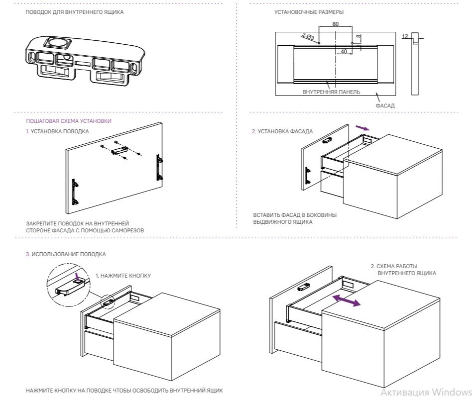 Поводок для внутренних ящиков, AQ крепится с внутренней стороны фасада и позволяет открывать/закрывать внутренний ящик одновременно с внешним. При необходимости использования внутреннего ящика независимо от внешнего, достаточно нажать кнопку, чтобы отщелкнуть поводок.