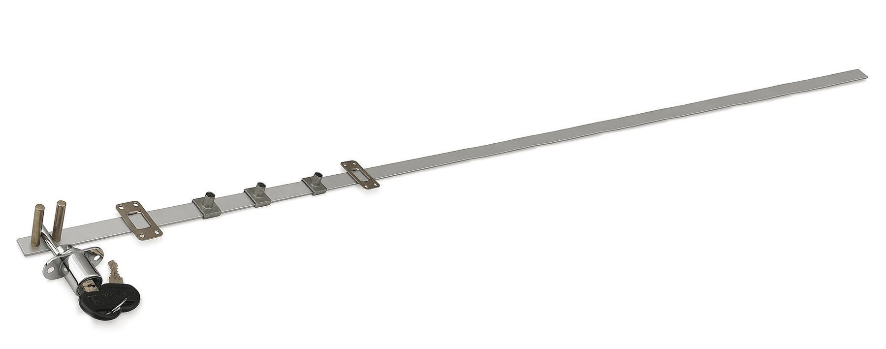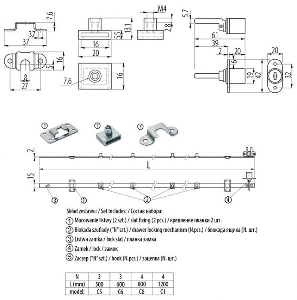 товара Замок центральный №288/1200 - устройство для запирания нескольких выдвижных ящиков. КОМПЛЕКТАЦИЯ Замок – 1 шт. Ключ – 2 шт. Планка замка – 1 шт. Крепление планки – 3 шт. Блокировщик ящика – 4 шт. Зацепка – 4 шт. ВАЖНОЕ ДОПОЛНЕНИЕ Для установки замка необходимо дополнительно приобрести крепеж – шурупы. Стопор, при необходимости, покупается дополнительно.